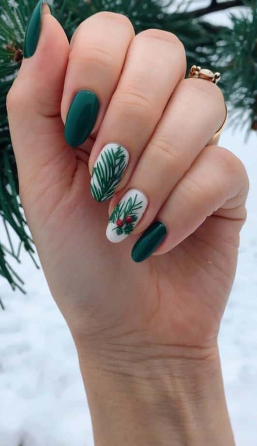 Delicate pine branch designs painted on nails bring a touch of winter wonderland magic to your fingertips. These forest-inspired motifs capture the cozy essence of the holiday season with their elegant simplicity.