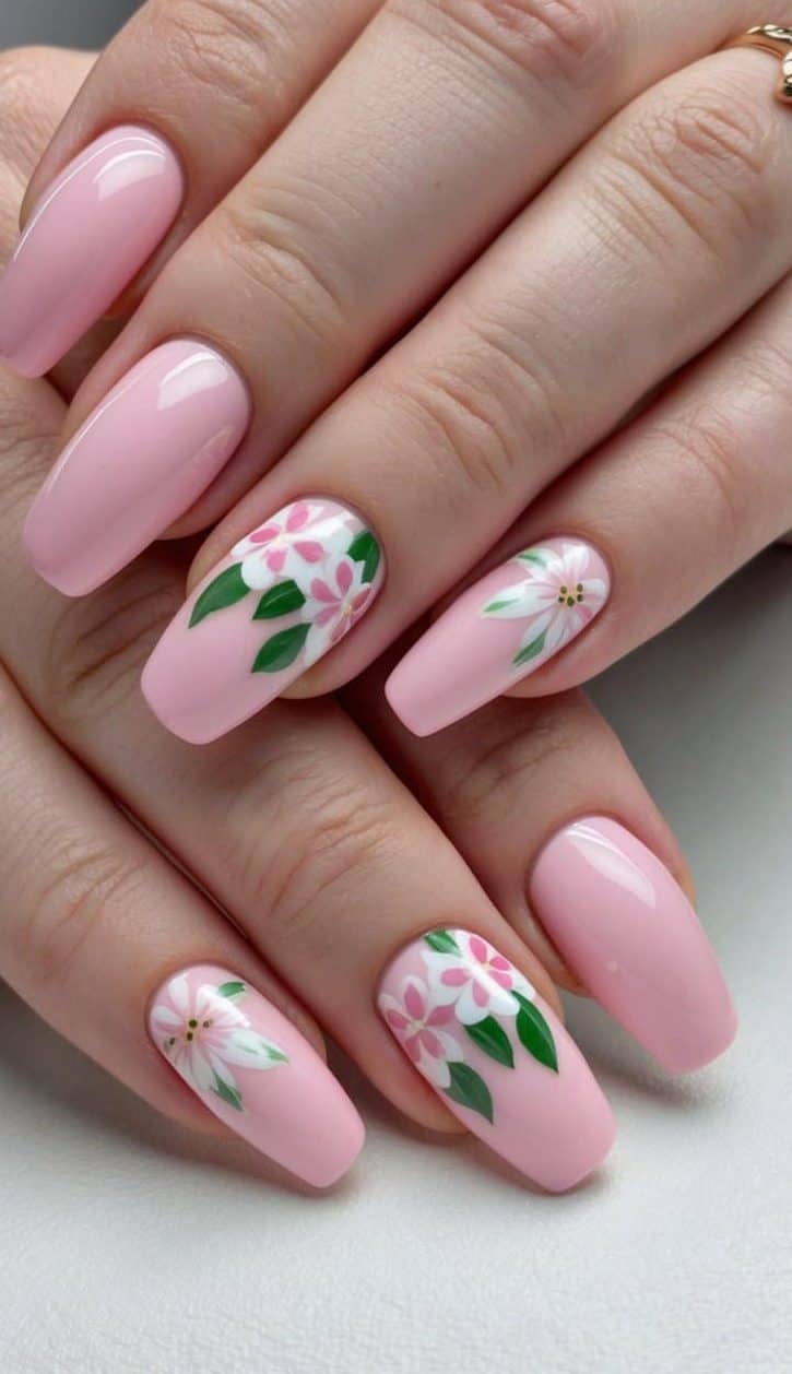 Dainty pink nails are graced with delicate white and pink flowers surrounded by vibrant green leaves. The gentle hues and spring blooms achieve a fresh and cheerful aesthetic.
